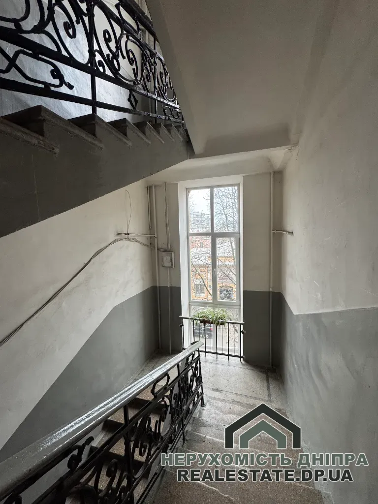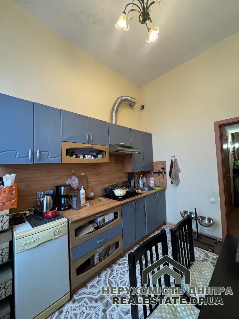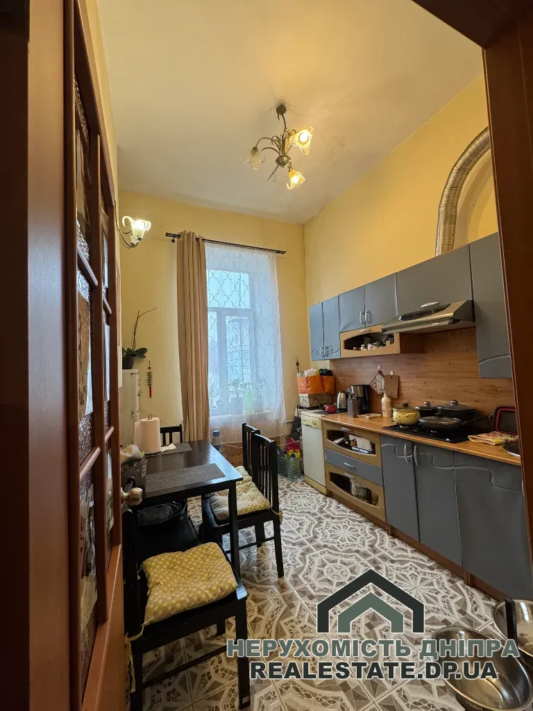 Загальна площа квартири — 40 м², з яких кухня займає 9 м². Висота стель становить 3,7 м. Вікна виходять у тихий закритий двір, є балкон.