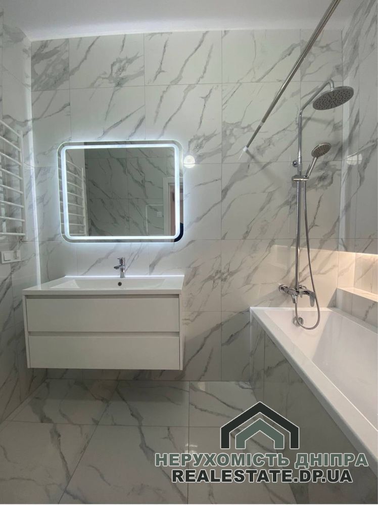 Квартира виконана за авторським дизайнерським проєктом. Ремонт робився для себе з використанням якісних матеріалів, не економлячи на деталях. Усі меблі та техніка, серед яких холодильник, посудомийна машина, варильна панель, духова шафа, пральна машина тощо, залишаються у квартирі. Вона повністю готова до проживання.