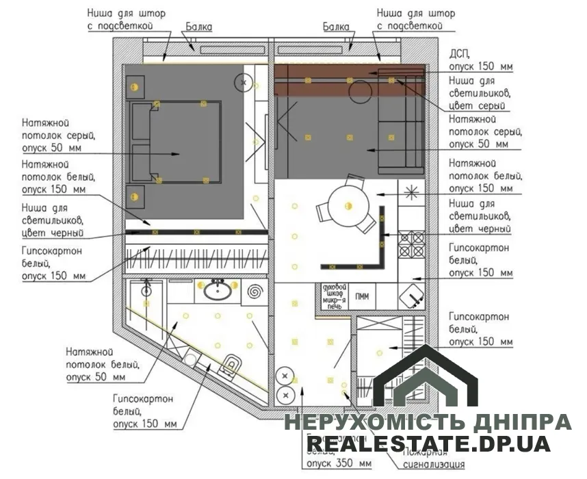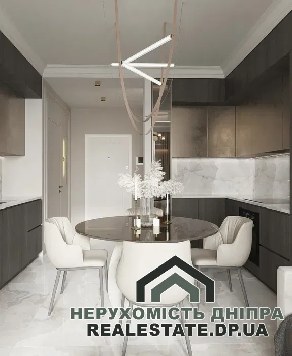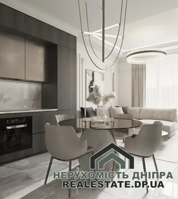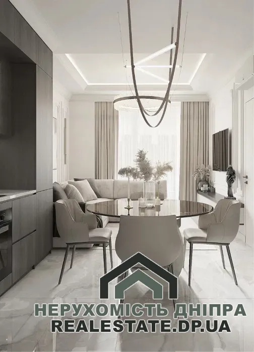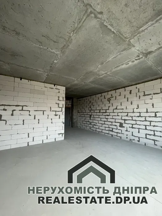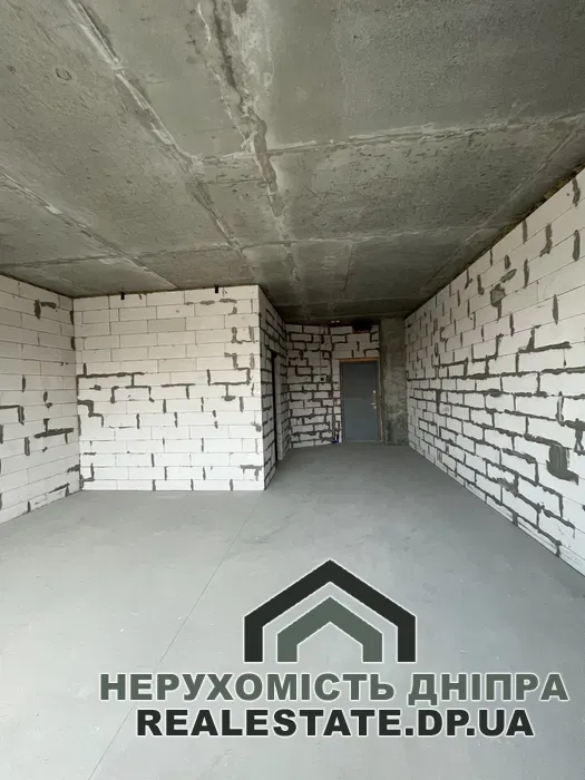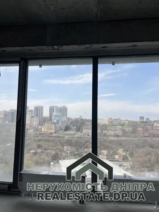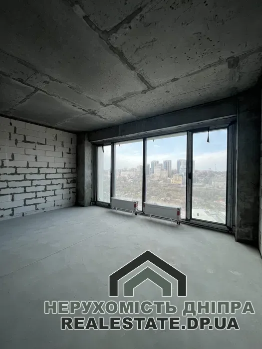 Квартира без внутрішнього оздоблення, має вільне планування, що дозволяє комфортно облаштувати простір: виділити окрему спальню, кухню-вітальню та великий санвузол. Приміщення оснащене панорамними вікнами, що відкривають гарний вид на центральну частину міста та річку Дніпро.