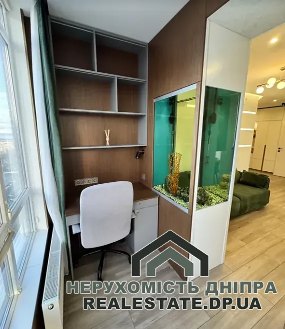 Вітальня має великий вбудований акваріум, а також декоративні ніші для створення особливого затишку. Лоджія облаштована як кабінет — ідеальне місце для роботи чи відпочинку.