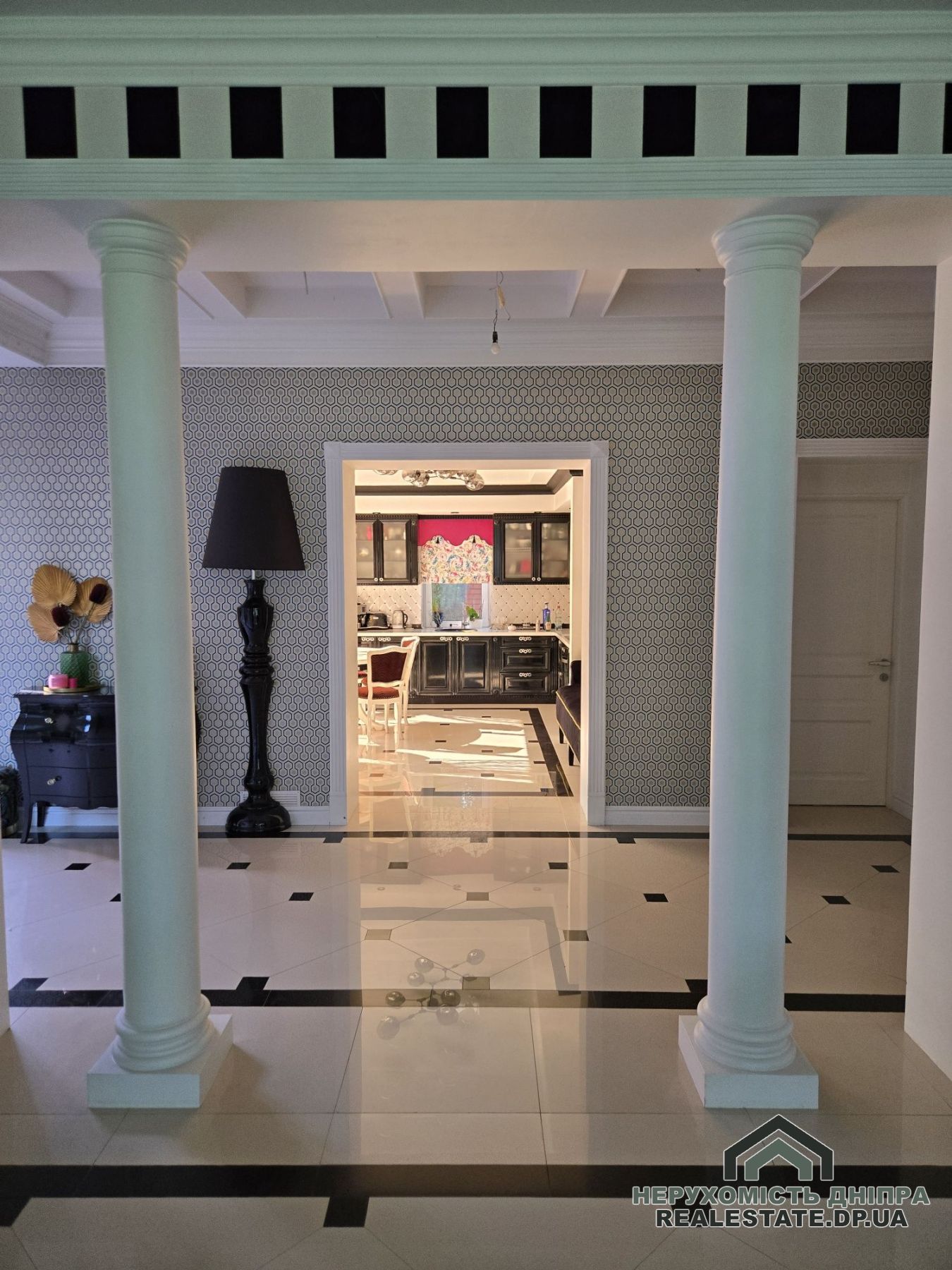 Будинок має зручне планування: три спальні, кабінет, вбиральню, кухню-студію, простору вітальню з каміном, два санвузли, лазню та спортзал. В інтер'єрі реалізовано дорогий якісний ремонт.