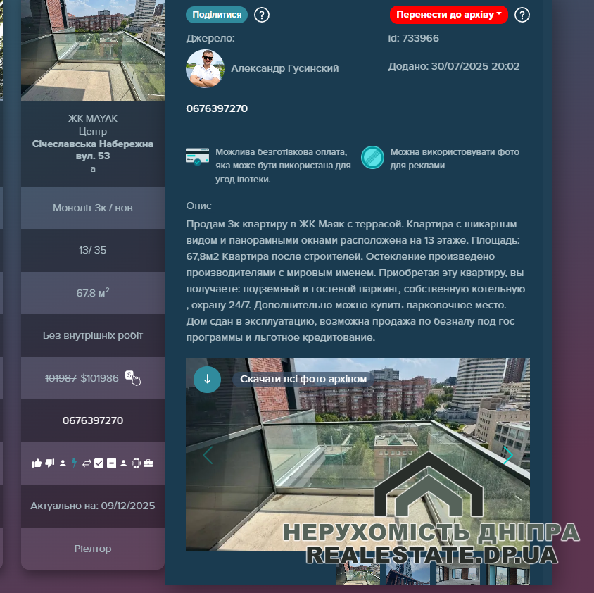 Продається двостороння квартира з терасою площею 67.8 м² у сучасному житловому комплексі MAYAK, розташованому в центрі міста на Січеславській Набережній, вул. 53а. Будівля побудована з моноліту, квартира трикімнатна, нова, знаходиться на 13-му поверсі 35-поверхового будинку.