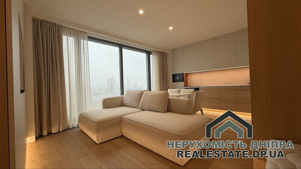 Квартира преміум-класу з авторським дизайном та студійним плануванням. Оснащена панорамними вікнами на всю висоту з видом на місто.